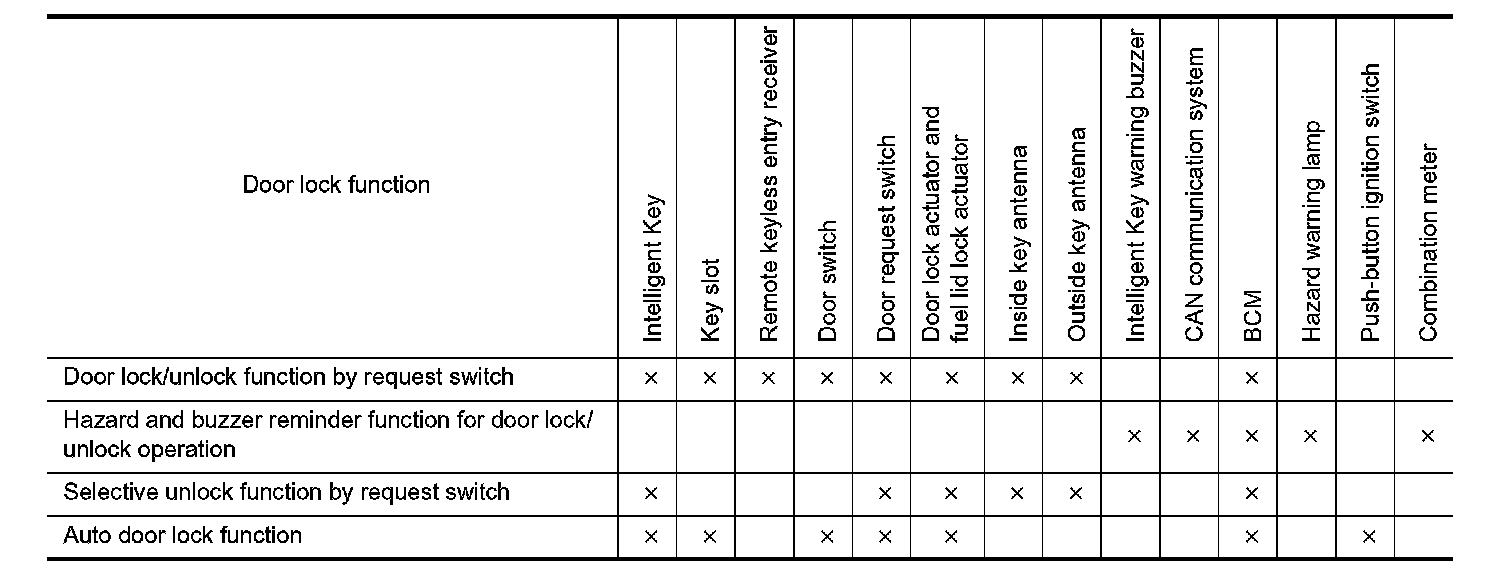 - BCM lock/unlock each door and fuel lid and sounds Intelligent Key buzzer warning (lock: 2 times, unlock: 1 time) at the same time as a reminder.