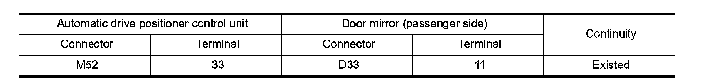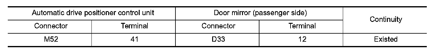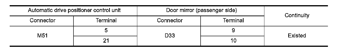3. Check continuity between automatic drive positioner control unit harness connector and door mirror (passenger side) harness connector.