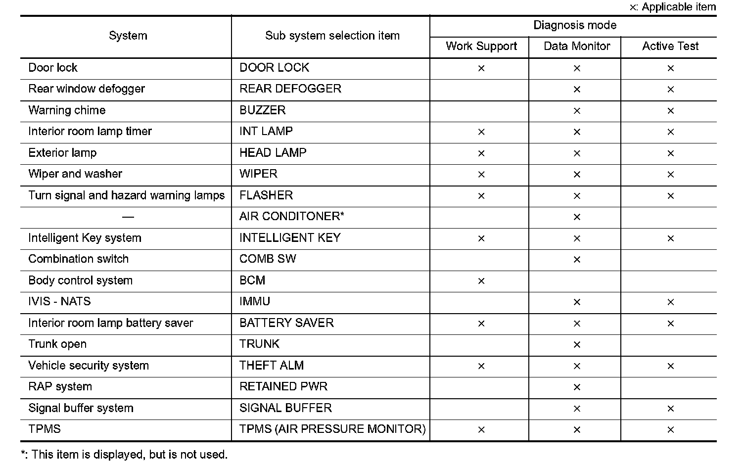 It can perform the diagnosis modes except the following for all sub system selection items.