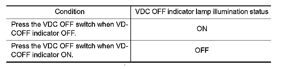Turn ON/OFF the VDC OFF switch and check that the VDC OFF indicator lamp in the combination meter turns