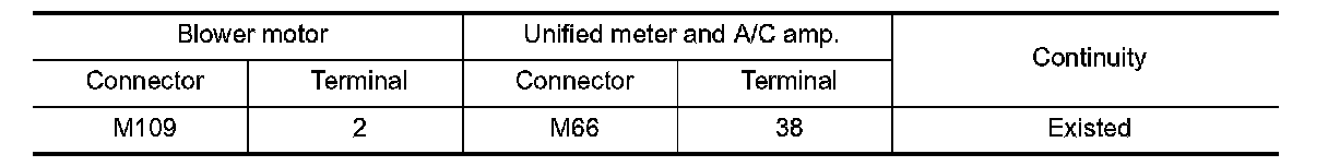 2. Check continuity between blower motor harness connector and unified meter and A/C amp. harness connector.