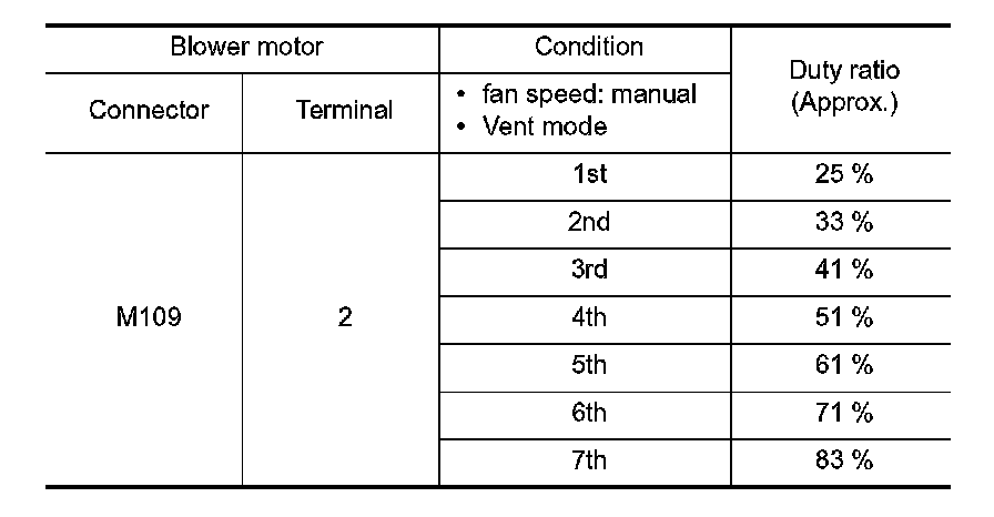 4. Change fan speed from Lo to Hi, and check duty ratios between blower motor harness connector and ground by using an oscilloscope.