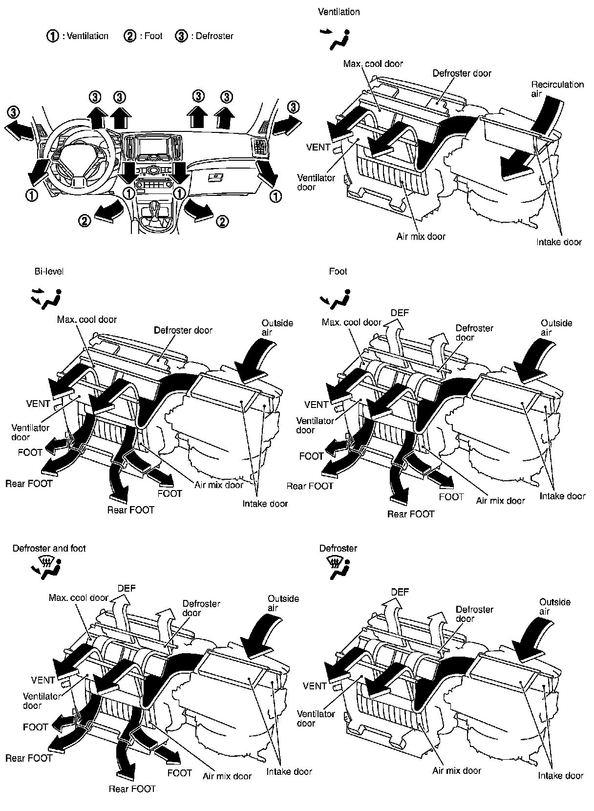 - Data sent from the unified meter and A/C amp. are selected according to data-based decisions made by the mode door motor, air mix door motors and intake door motor.