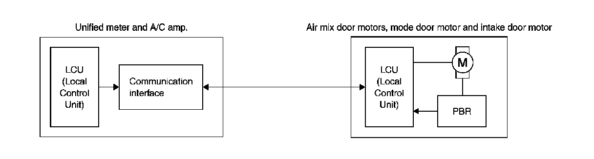 The mode door motor, air mix door motors and intake door motor read their respective signals according to the address signal. Opening angle indication signals received from the unified meter and A/C amp. and each of the motor position sensors is compared by the LCUs in each door motor with the existing decision and opening angles. Subsequently, HOT/COLD, DEF/VENT and FRE/REC operation is selected. The new selection data is returned to the unified meter and A/C amp.