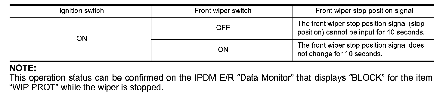 When a front wiper stop position signal is in the conditions listed below, IPDM E/R stops power supply to wiper after repeating a front wiper 10 seconds activation and 20 seconds stop five times.