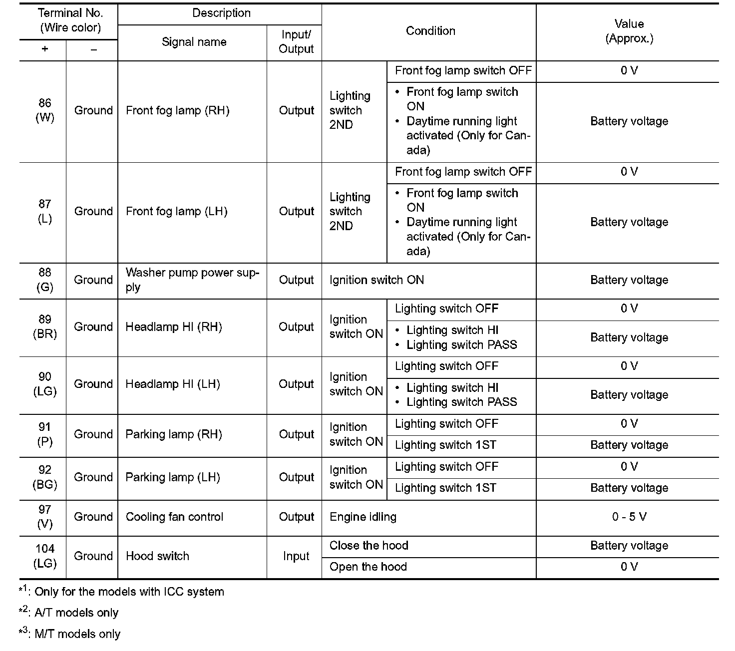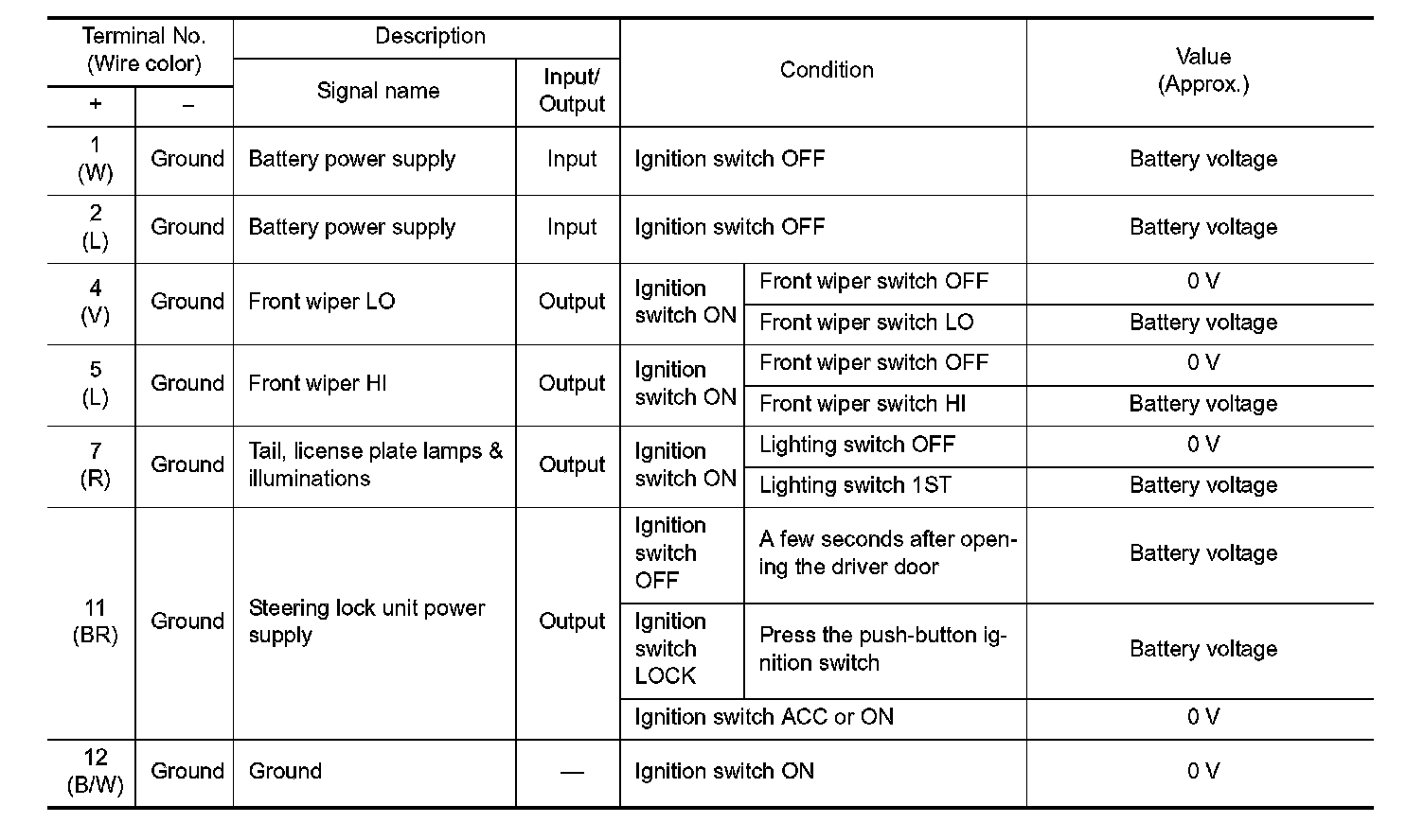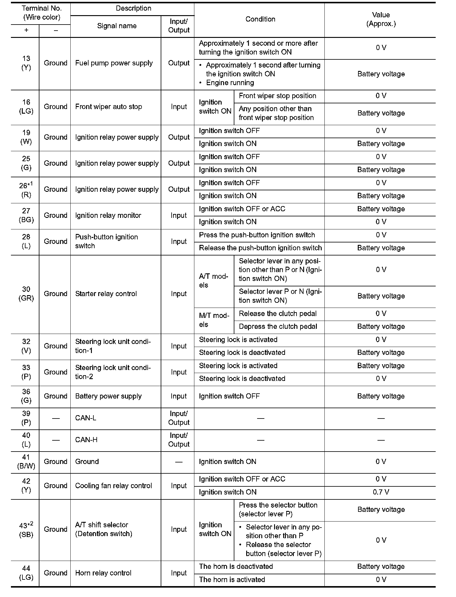 Pinout Values and Diagnostic Parameters