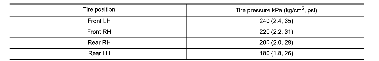 1. Adjust the tire pressure for all wheels to match the list below.