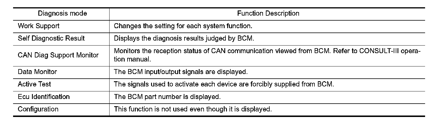 CONSULT-III performs the following functions via CAN communication with BCM.