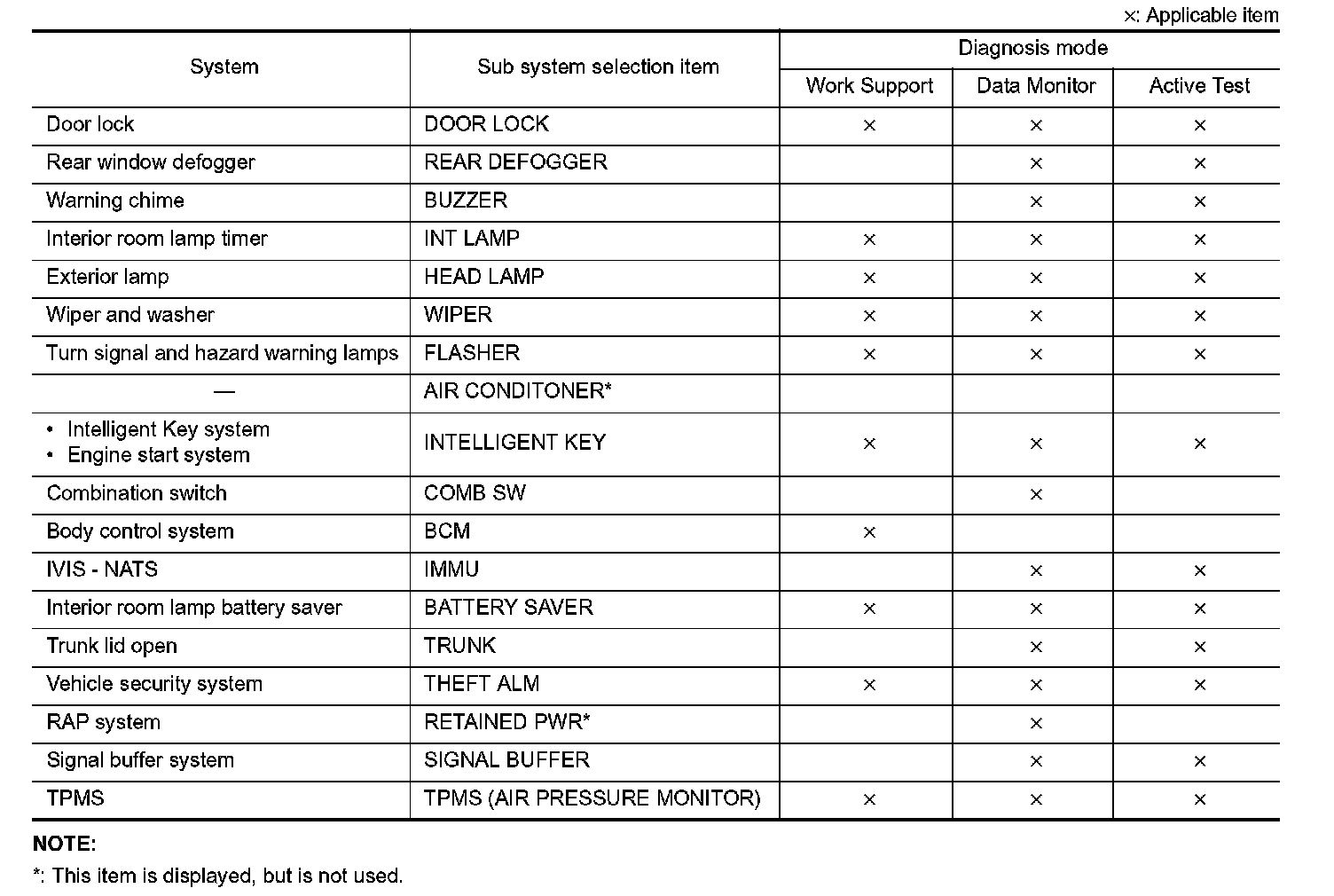 It can perform the diagnosis modes except the following for all sub system selection items.