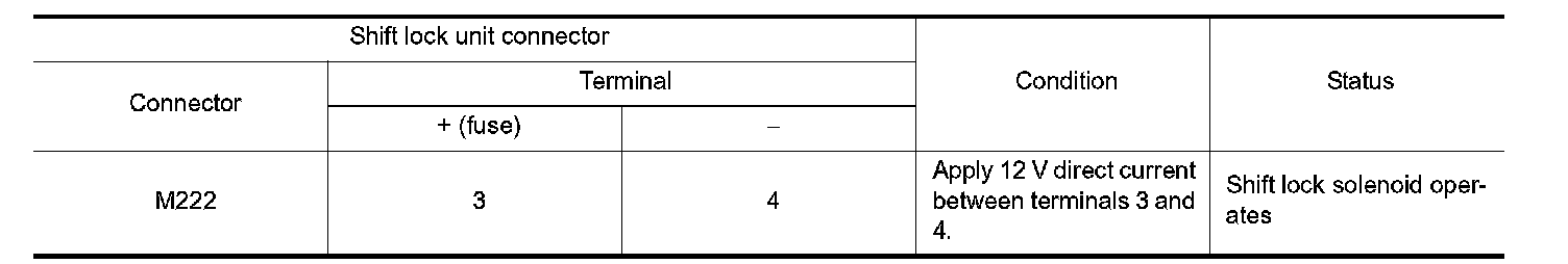 Apply voltage to terminals 3 and 4 of shift lock unit connector, and then check that shift lock solenoid is activated.