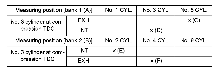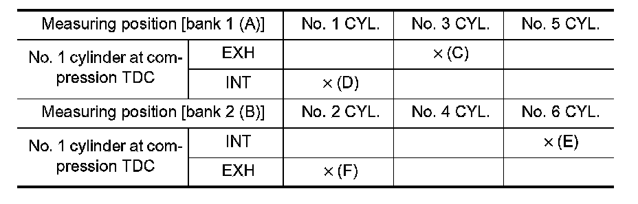 - By referring to the figure, measure the valve clearances at locations marked "�" as shown in the table below (locations indicated in the figure).