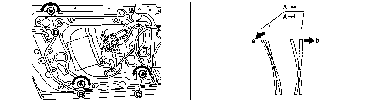 - When adjusting with adjusting bolt (D), turn the adjusting bolt clockwise to move the door glass upper end inward, then anticlockwise to move the door glass upper end outward.