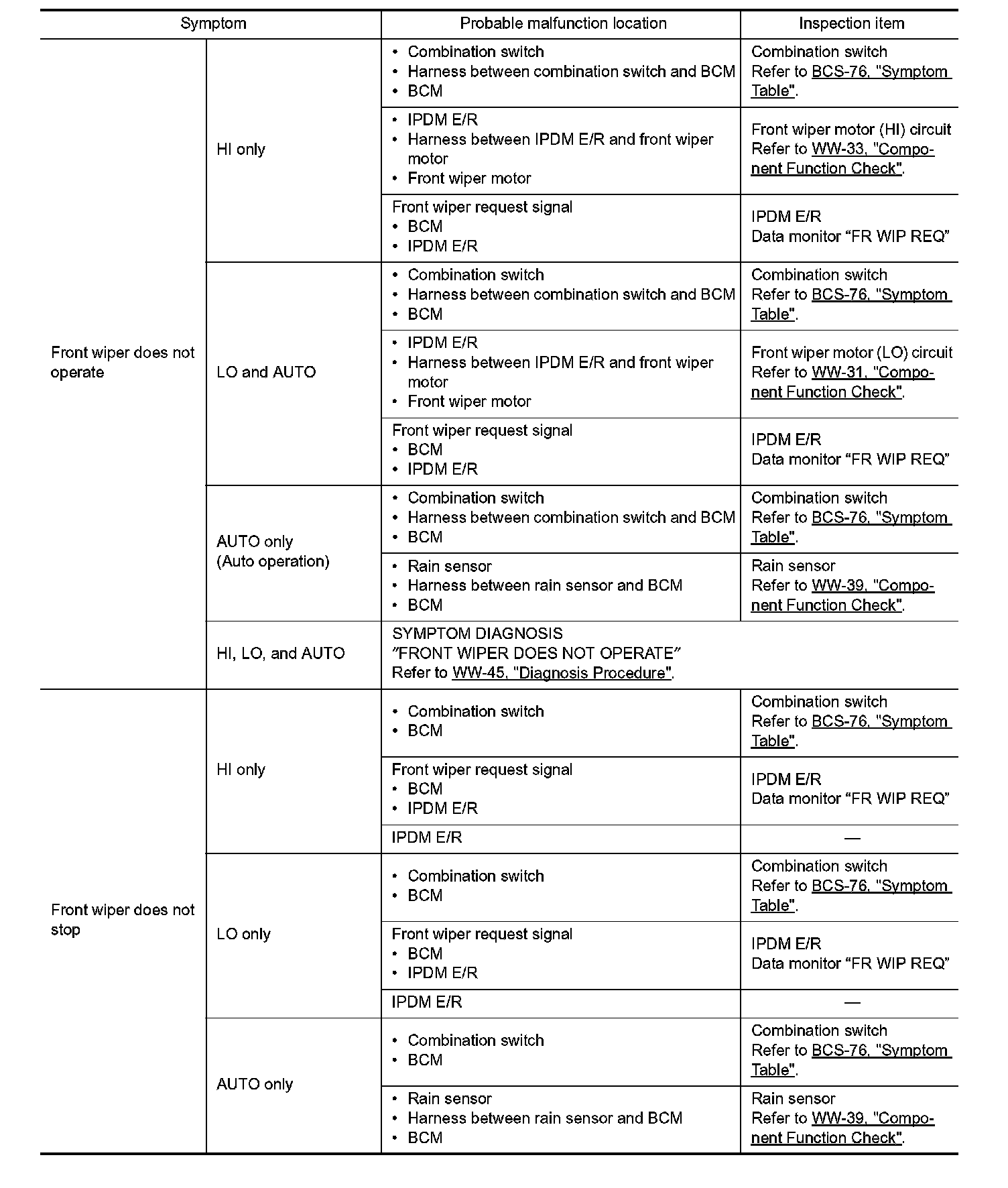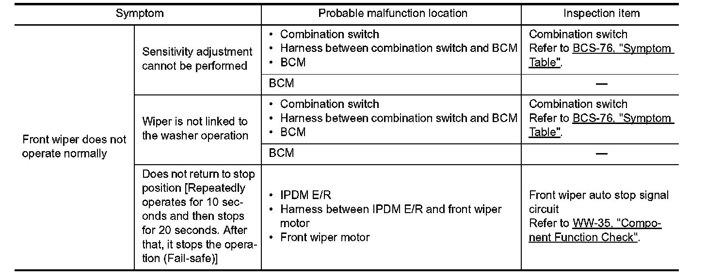 FRONT WIPER AND WASHER SYSTEM SYMPTOMS