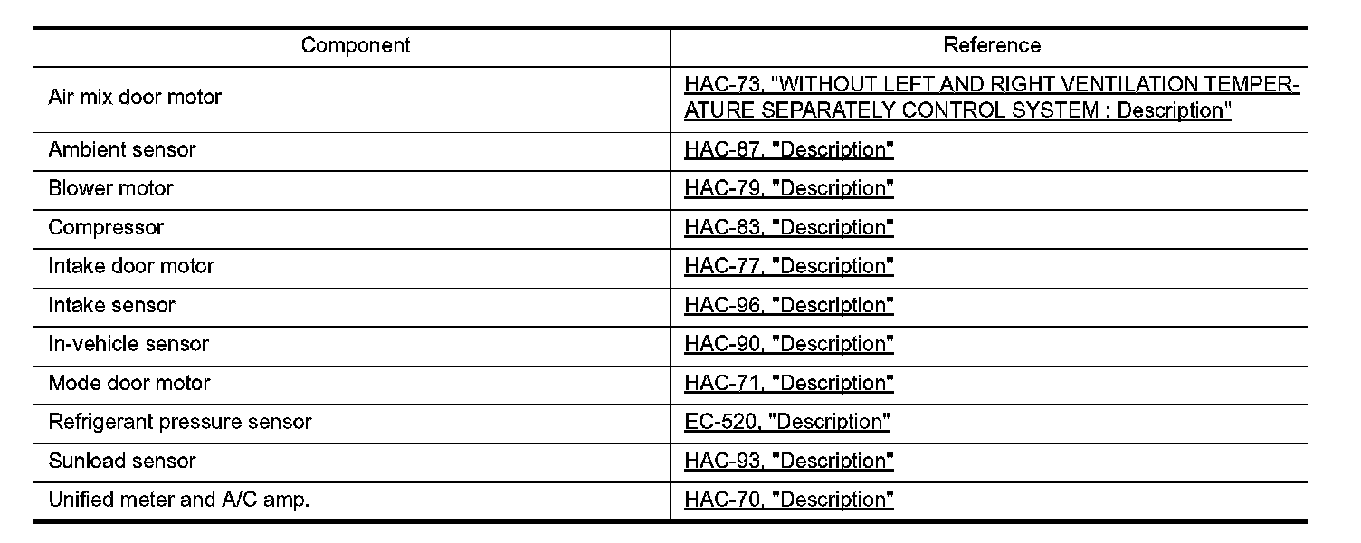 WITHOUT LEFT AND RIGHT VENTILATION TEMPERATURE SEPARATELY CONTROL SYSTEM : Component Description