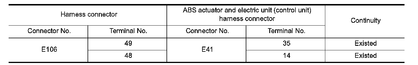 NO - Repair the main line between the harness connector E106 and the ABS actuator and electric unit
