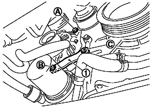 8. Remove alternator mounting bolt (B) and alternator stay mounting bolt (C) using power tools, then remove alternator stay (1).