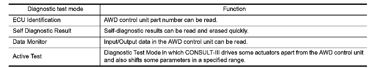 Use this mode to determine and identify the details of a malfunction based on self-diagnostic results or data monitor. AWD control unit gives drive signal to actuator with receiving command from CONSULT-III to check operation of actuator.
