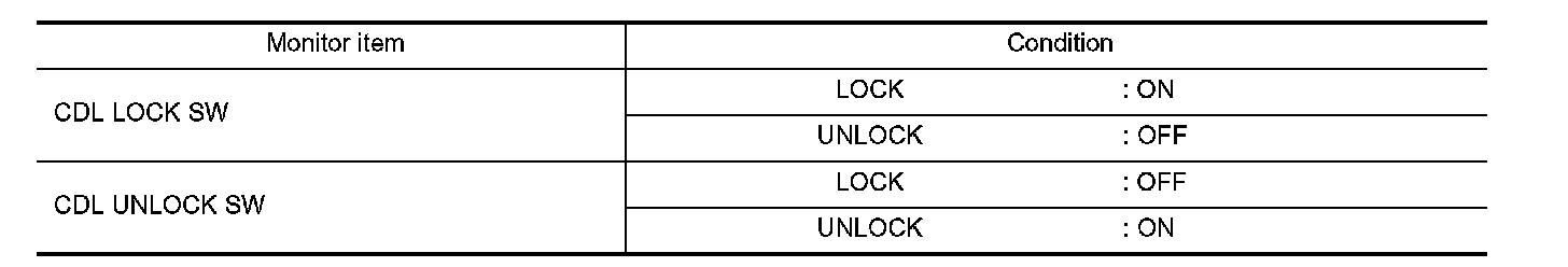 Check ("CDL LOCK SW ", "CDL UNLOCK SW") in "DATA MONITOR" mode for "POWER DOOR LOCK SYSTEM" with CONSULT-III. Common Item, "COMMON ITEM : CONSULT-III Function (BCM - COMMON