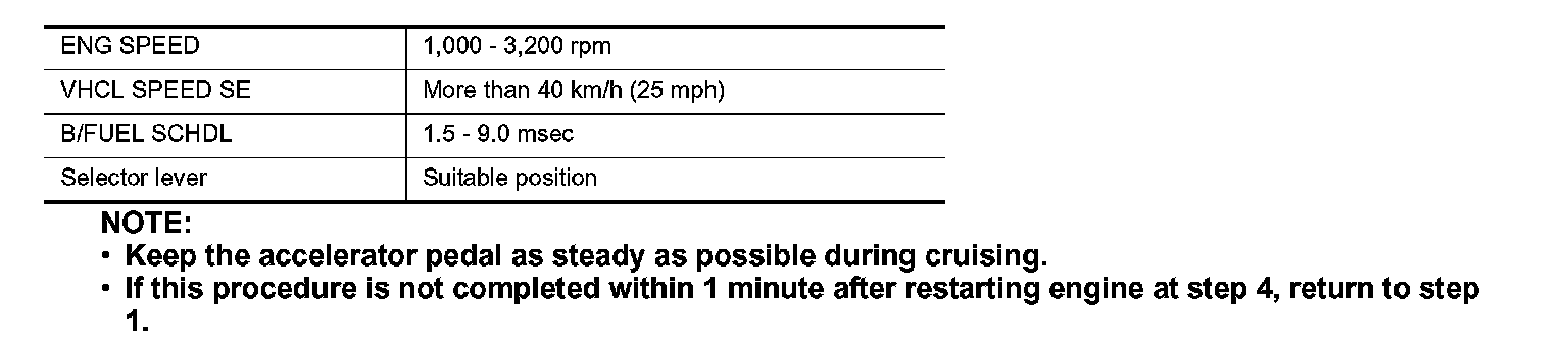 5. Drive and accelerate vehicle to more than 40 km/h (25 MPH) within 20 seconds after restarting engine.