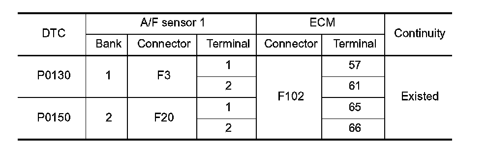 3. Check the continuity between A/F sensor 1 harness connector and ECM harness connector.