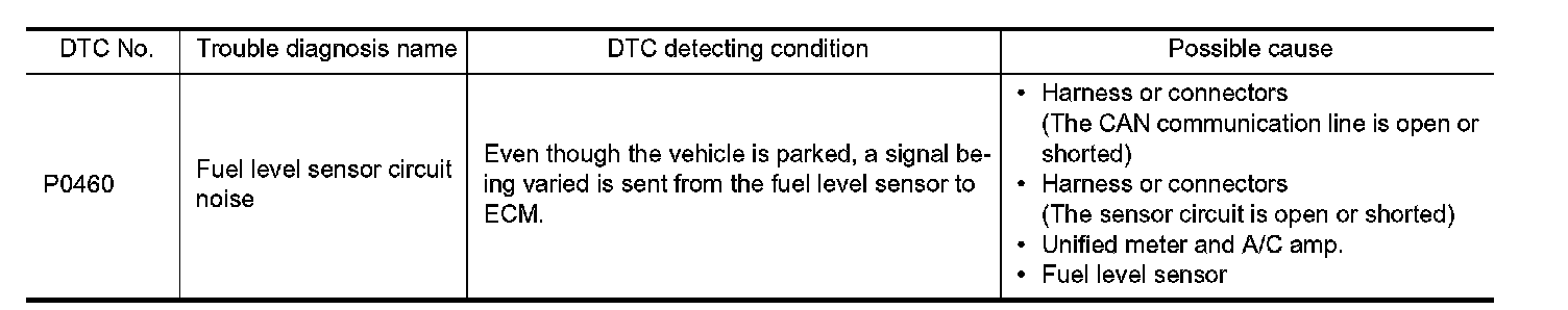 - If DTC P0460 is displayed with DTC UXXXX, first perform the trouble diagnosis for DTC UXXXX.