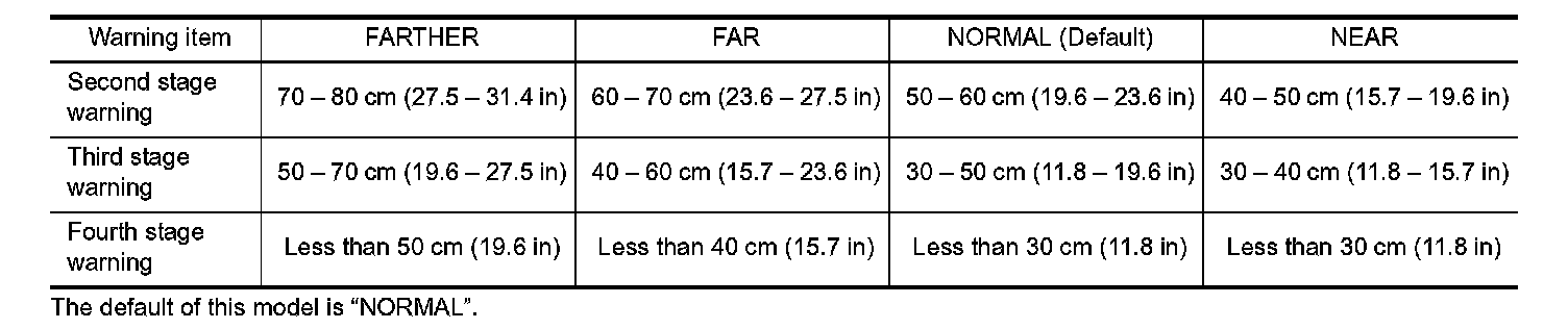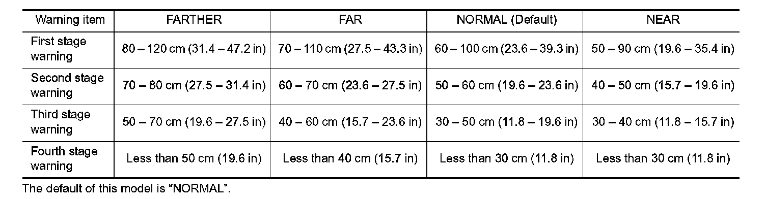 Center sensor (RR, RL) only is adjustable not to detect the distance less than 40 cm (15.7 in).