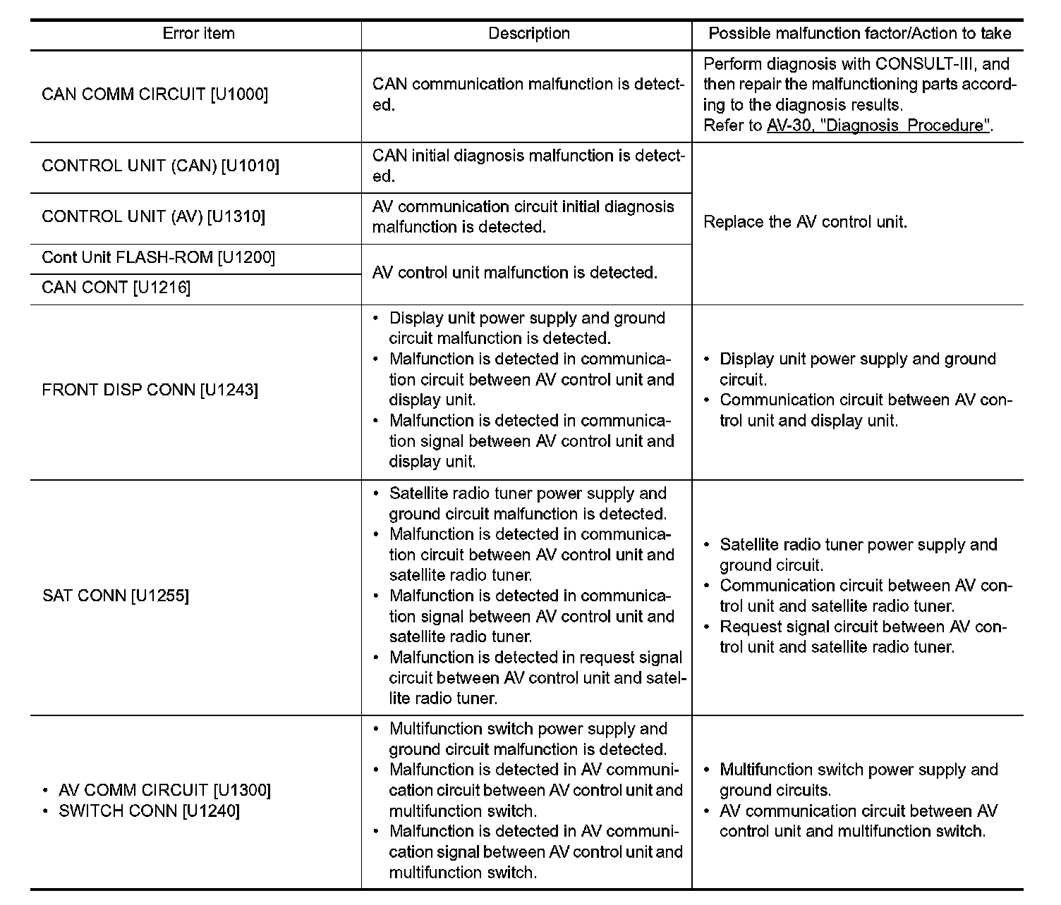 CONSULT-III performs the following functions via the communication with the AV control unit.