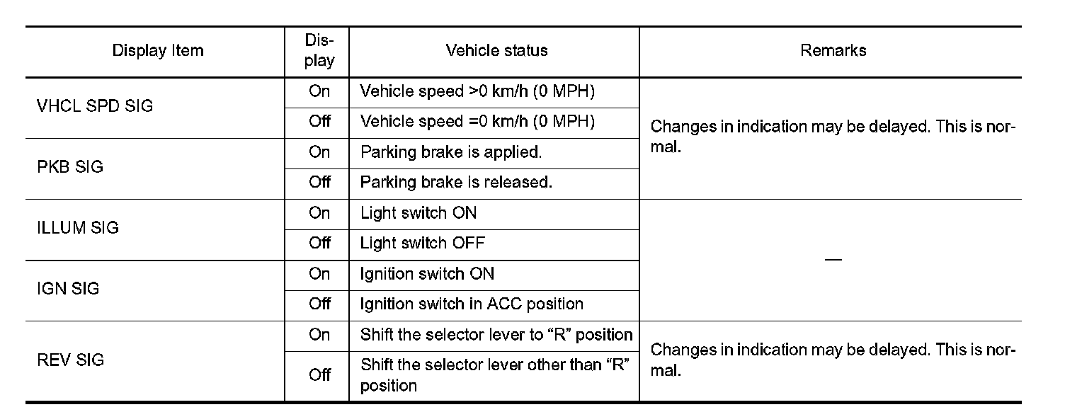 - Displays the status of the following vehicle signals inputted into the AV control unit.