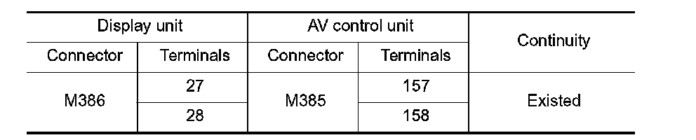 3. Check continuity between display unit harness connector and AV control unit harness connector.