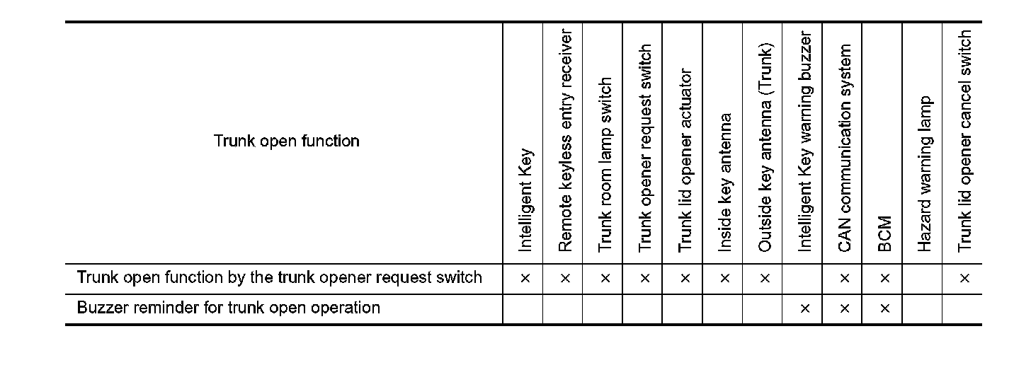- When BCM receives the trunk open request signal, it operates the trunk lid opener actuator and opens the trunk.