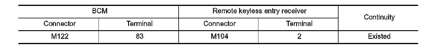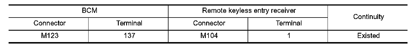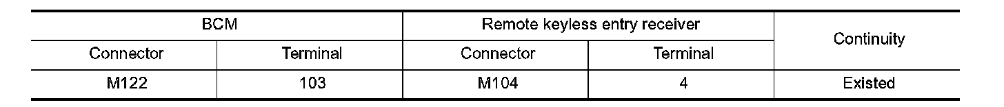 2. Check continuity between BCM harness connector and remote keyless entry receiver harness connector.