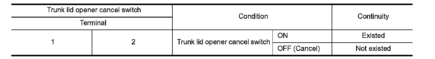 3. Check continuity between trunk lid opener cancel switch terminals.