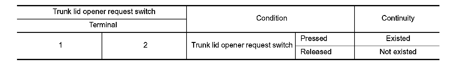 3. Check continuity between trunk lid opener request switch terminals.