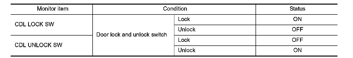 Check ("CDL LOCK SW ", "CDL UNLOCK SW") in "Data Monitor" mode with CONSULT-III.