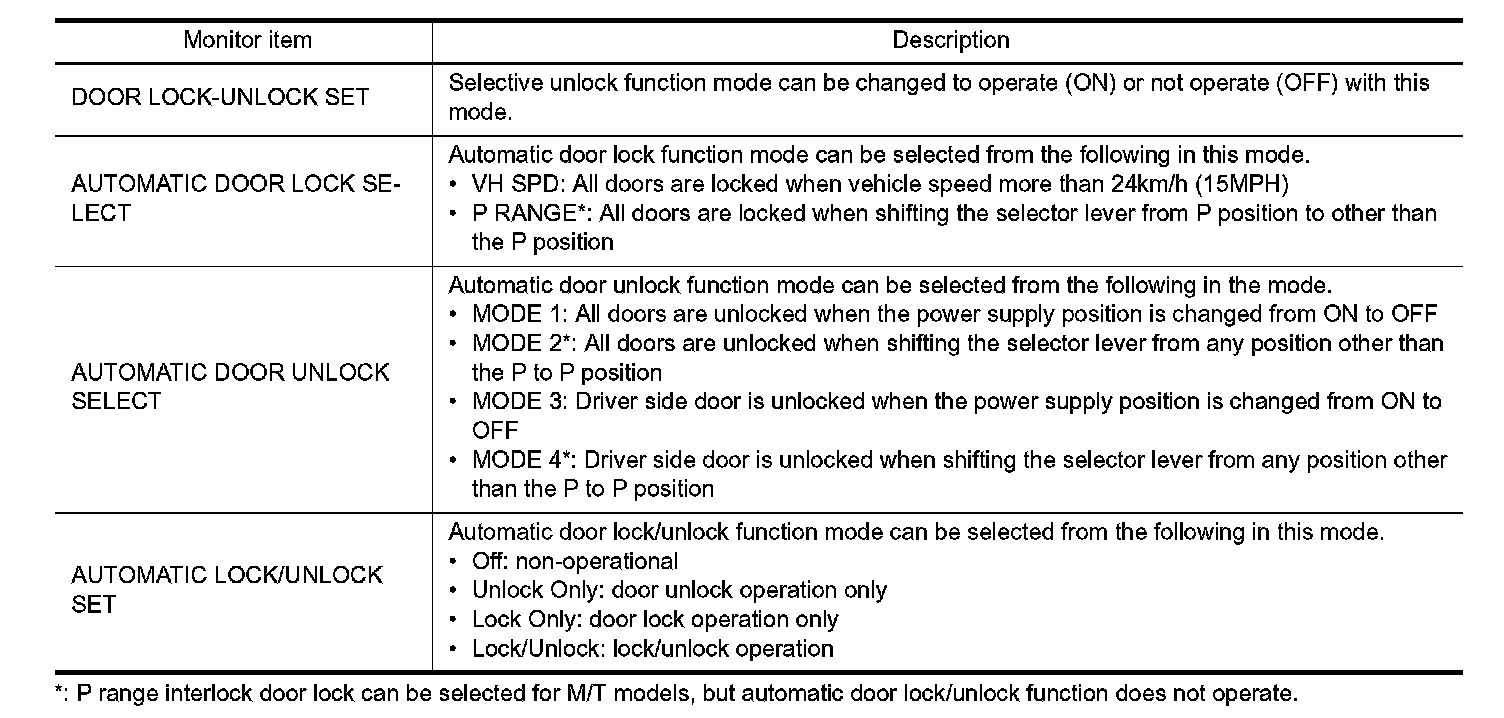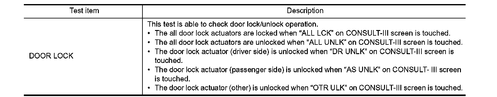 DOOR LOCK : CONSULT-III Function (BCM - DOOR LOCK)