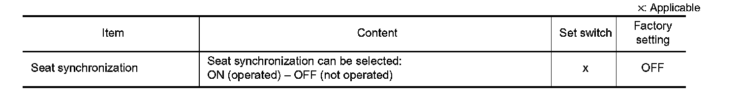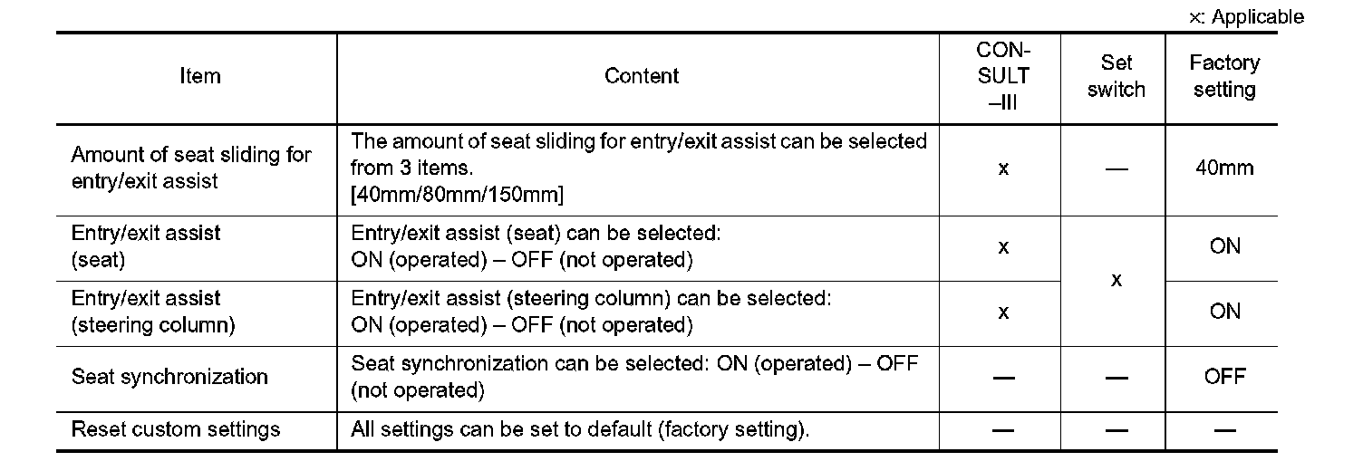 The settings of the automatic driving positioner system can be changed, using CONSULT-III, and the set switch. Always check the settings before and after disconnecting the battery terminal or replacing driver seat control unit.
