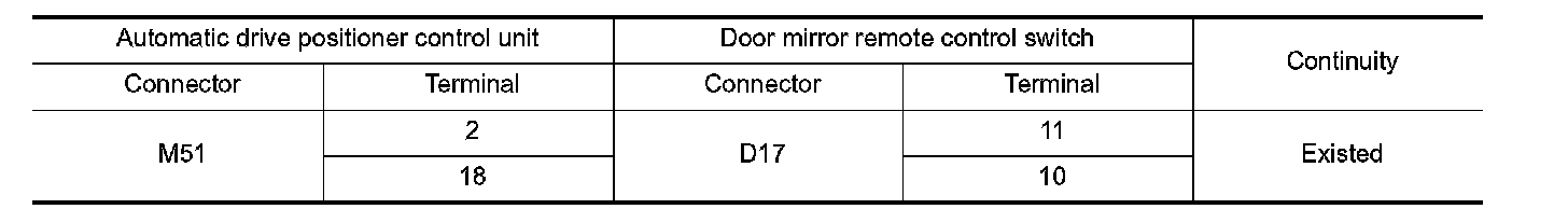 3. Check continuity between automatic drive positioner control unit harness connector and door mirror remote control switch harness connector.