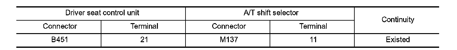 3. Check continuity between driver seat control unit harness connector and A/T shift selector harness connector.