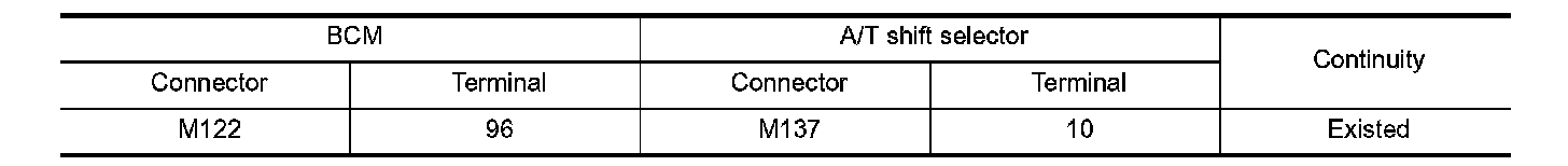 3. Check continuity between BCM harness connector and A/T shift selector harness connector.