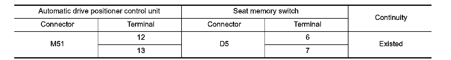 3. Check continuity between automatic drive positioner control unit harness connector and seat memory switch harness connector.