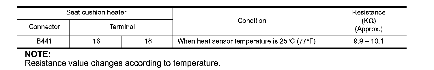 3. Check resistance between seat cushion heater terminals.