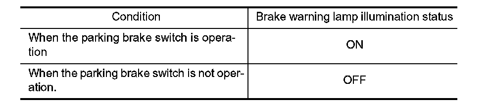 Operate the parking brake lever (M/T models) or the parking brake pedal (A/T models). Then check that the brake warning lamp in the combination meter turns on/off correctly.