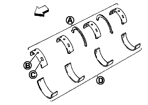 - Main bearing with oil hole (B) and groove (C) goes on cylinder block. The one without them goes on lower cylinder block.