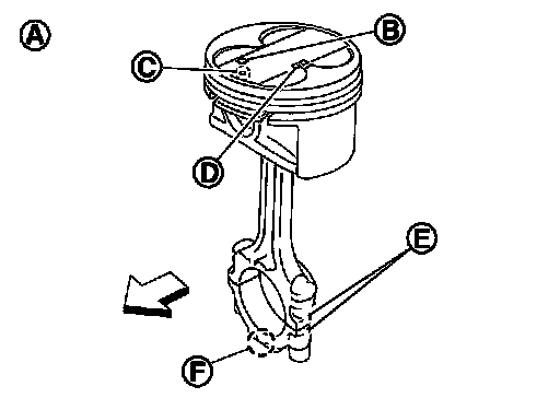 - Assemble so that the front mark on the piston head and the cylinder number on connecting rod are positioned as shown in the figure.
