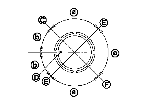 - Install thrust bearings with the oil groove (E) facing crankshaft arm (outside).