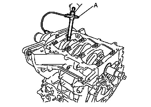 50 mm (1.97 in)] into bolt holes (A). Then equally tighten each bolt, and remove lower cylinder block.