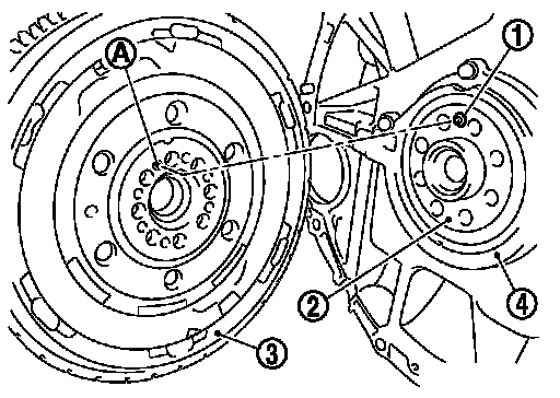 - When installing flywheel (3) to crankshaft (2), be sure to correctly align crankshaft side dowel pin and flywheel side dowel pin hole (A).