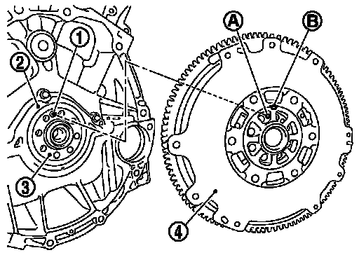 - There is a matching mark (B) on the clutch cover side of flywheel (4). Refer it during installation.