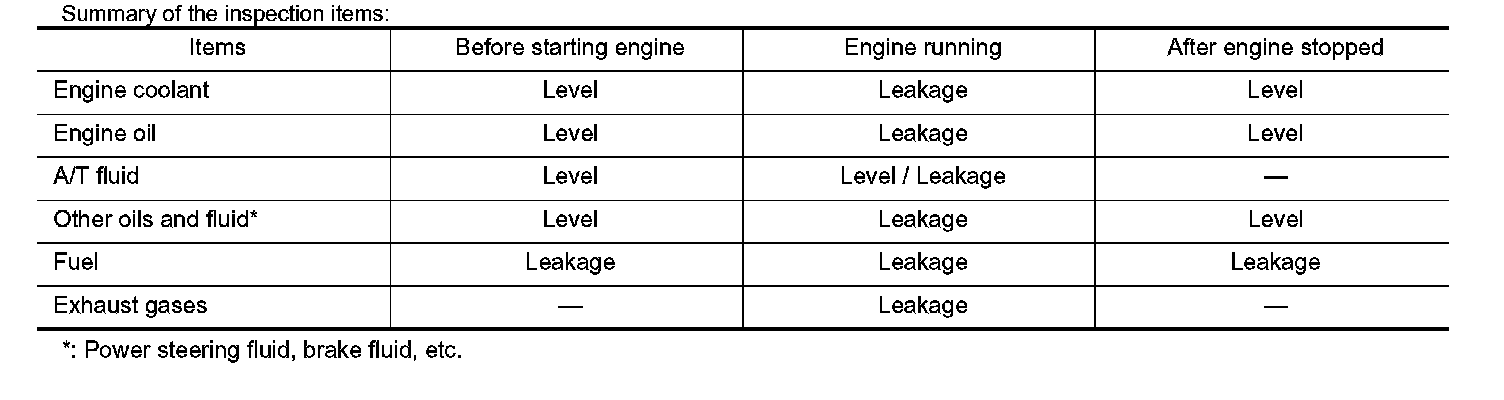 The following are procedures for checking fluids leak, lubricates leak and exhaust gases leak.