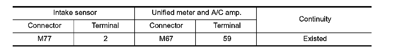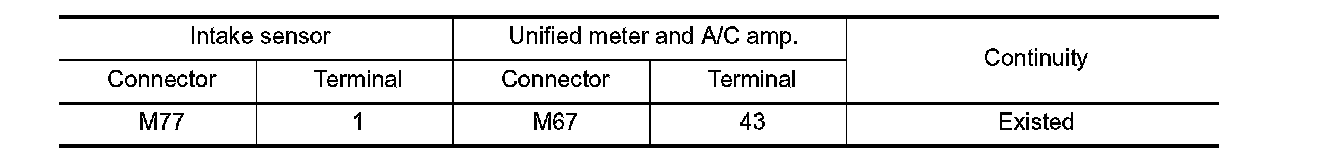 3. Check continuity between intake sensor harness connector and unified meter and A/C amp. harness connector.